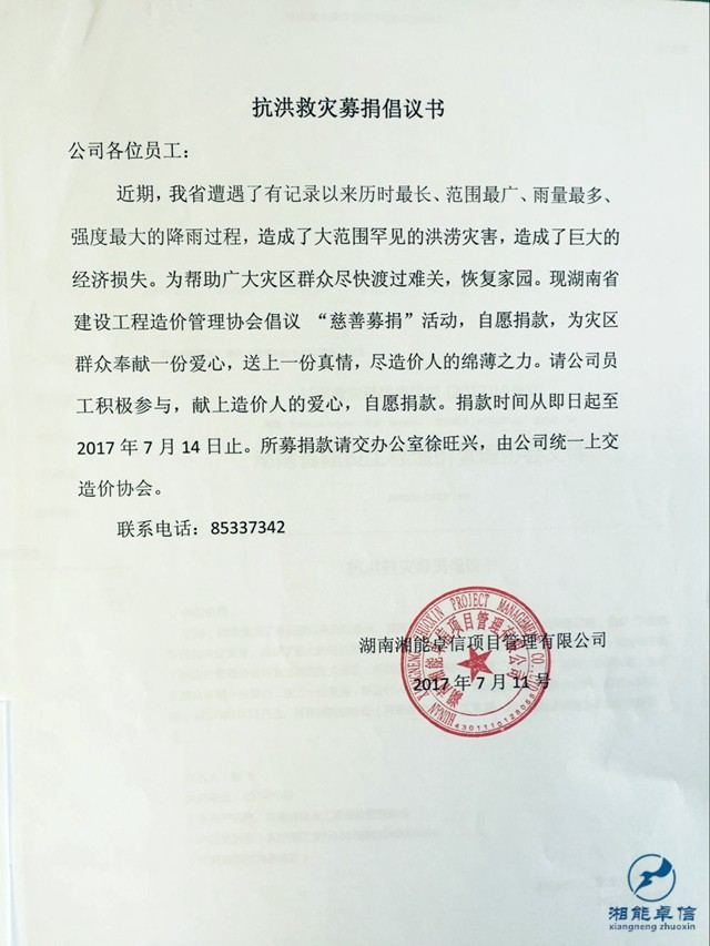 2017年7月10日湖南省建设工程造价管理协会组织开展抗洪救灾“慈善募捐”活动。我单位积极响应发出倡议,募得捐款共:5470元,已如数上交湖南省工程造价管理协会。